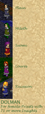The Dolman may be worn by female Priests who have gained seventy-one or more Insights. The cloth dress is hemmed with soft gray velvet at the cuffs and neckline. The Plain Dolman is crafted by the Mundanes with spirulina, capsic bark and angelica. The four dyes available at various other locations require significant Aisling labor. The Mileth variant is dyed with spirulina, bittersweet and capsic bark. The Suomi variant is dyed with spirulina, capsic bark, hyssop and paola nut. The Loures variant is dyed with trigonelle, spirulina and capsic bark. The Rucesion variant is dyed with capsic bark, spirulina and angelica.