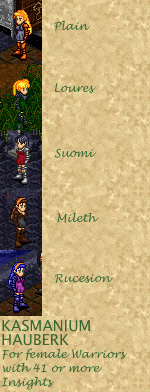 The Kasmanium Hauberk may be worn by female Warriors who have gained forty-one or more Insights. The body of the armor is woven of pure, tensile kasmanium while the sleeves and high boots are made of leather. The Plain Hauberk is crafted by the Mundanes with angelica, hyssop, paola nut, spirulina and capsic bark. The four dyes available at various other locations require significant Aisling labor. The Loures variant is dyed with capsic bark, bittersweet and angelica. The Suomi variant is dyed with hyssop, capsic bark and spirulina. The Mileth variant is dyed with capsic bark and chicory. The Rucesion variant is dyed with angelica, trigonelle and capsic bark.