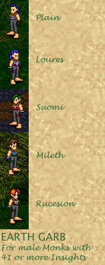 The Earth Garb may be worn by male Monks who have gained forty-one or more Insights. The Plain Earth Garb is crafted by the Mundanes with capsic bark, hyssop, paola nut and angelica. The four dyes available at various other locations require significant Aisling labor. The Loures variant is dyed with chicory, hyssop, spirulina, paola nut and angelica. The Suomi variant is dyed with capsic bark, paola nut and hyssop. The Mileth variant is dyed with capsic bark, angelica, hyssop and bittersweet. The Rucesion variant is dyed with capsic bark, hyssop and spirulina.
